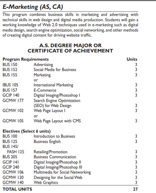 Looking for the skills you need for today’s in-demand marketing jobs in internet marketing, digital advertising, and social media? Then, you’ve found the right program. The new E-Marketing (as a certificate or A.S. degree) combines business skills in marketing and advertising with technical skills in web design and digital media production. Students will gain a working knowledge of Web 2.0 techniques used in E-Marketing such as digital media design, search engine optimization, social networking, and other methods of creating digital content for driving website traffic. See the courses required below: